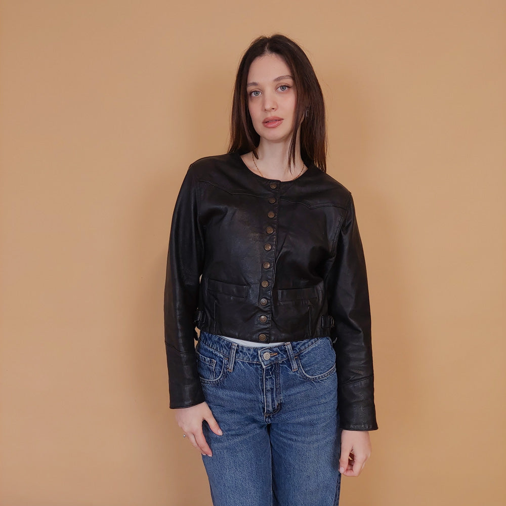 VIN-OUTW-34135 Vintage δερμάτινο κροπ σακάκι S-M