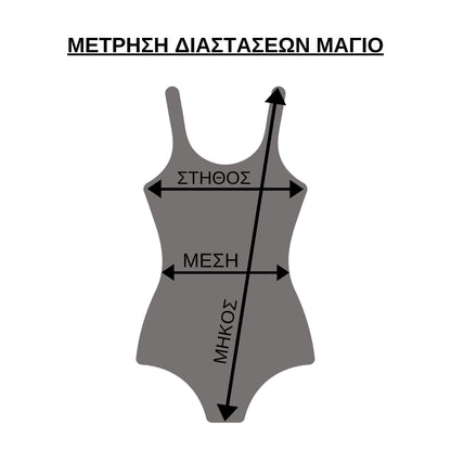 ΔΙΑΣΤΑΣΕΙΣ: Στήθος: 47cm, Μέση: 40cm, Μήκος: 75cm (μέτρηση από άκρη σε άκρη, ελάχιστη διάσταση, όλα τα μαγιό είναι ελαστικά).